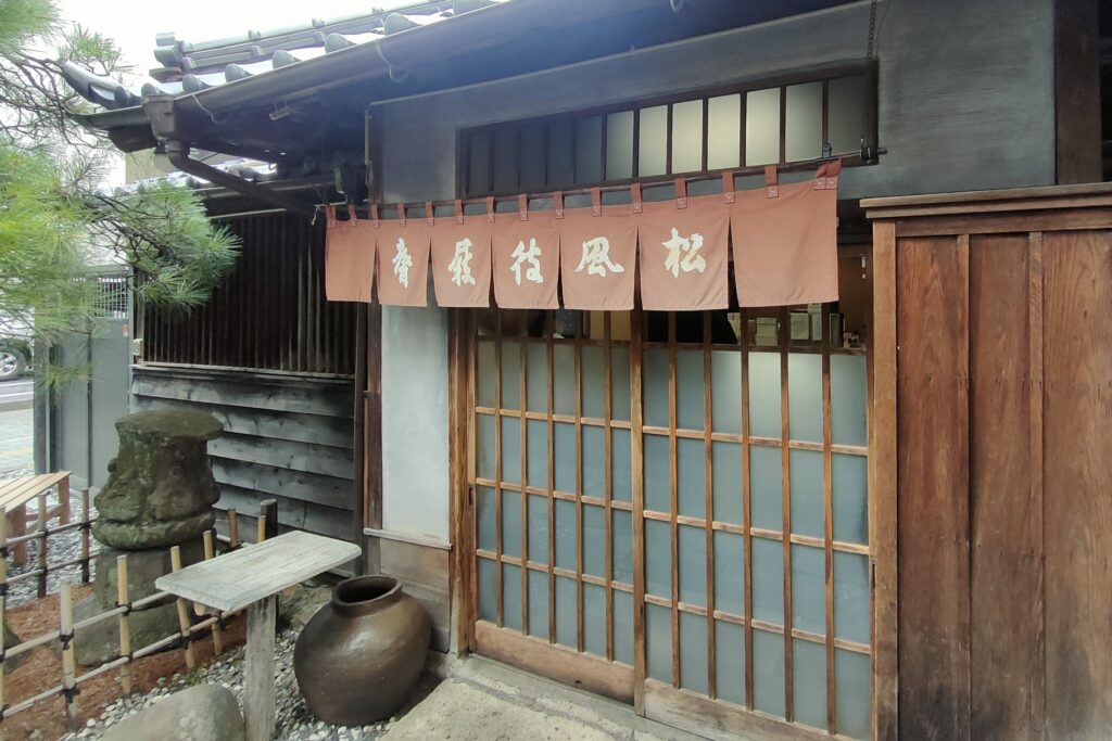 店先にかかる暖簾には「松風待履声」と書かれています。松の木を渡る風の音を待つ(楽しむ)という詩的な表現。「湯を沸かしてお待ちしています」という意味が隠されているようです。