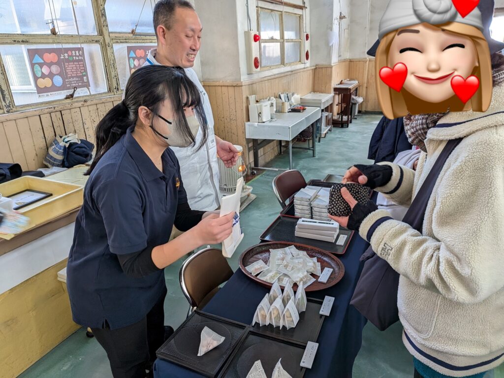 3つの教室が会場として使用されていましたが、いずれの教室もお客さんでいっぱいでした。因みに校庭の一部分にテントとストーブが置かれ、和菓子を持って一服できるお茶席が整えられていました。